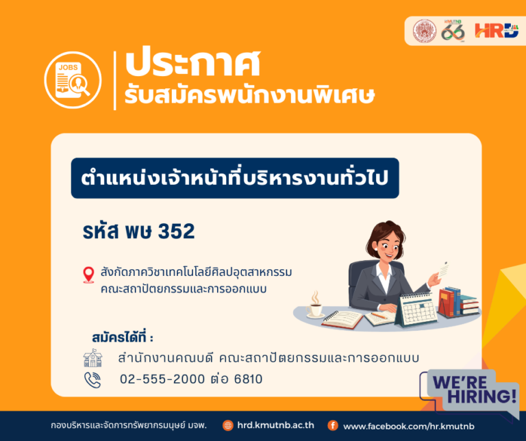 รับสมัครพนักงานพิเศษ ตำแหน่งเจ้าหน้าที่บริหารงานทั่วไป รหัส พษ 604 สังกัดสำนักงานบริหารอุทยาน อุทยานเทคโนโลยี มจพ. 20/03/2026 / ข่าวรับสมัครงาน, พนักงานพิเศษ