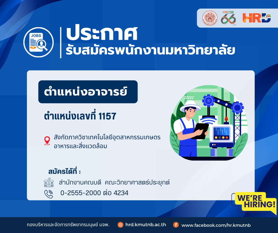 ประกาศรับสมัครพนักงานมหาวิทยาลัย ตำแหน่งอาจารย์ ตำแหน่งเลขที่ 1157 สังกัดภาควิชาเทคโนโลยีอุตสาหกรรมเกษตร อาหารและสิ่งแวดล้อม คณะวิทยาศาสตร์ประยุกต์By HRD KMUTNB / 20/11/2025 View FullscreenSkip to PDF content ถึงวันที่ 20 กุมภาพันธ์ 68